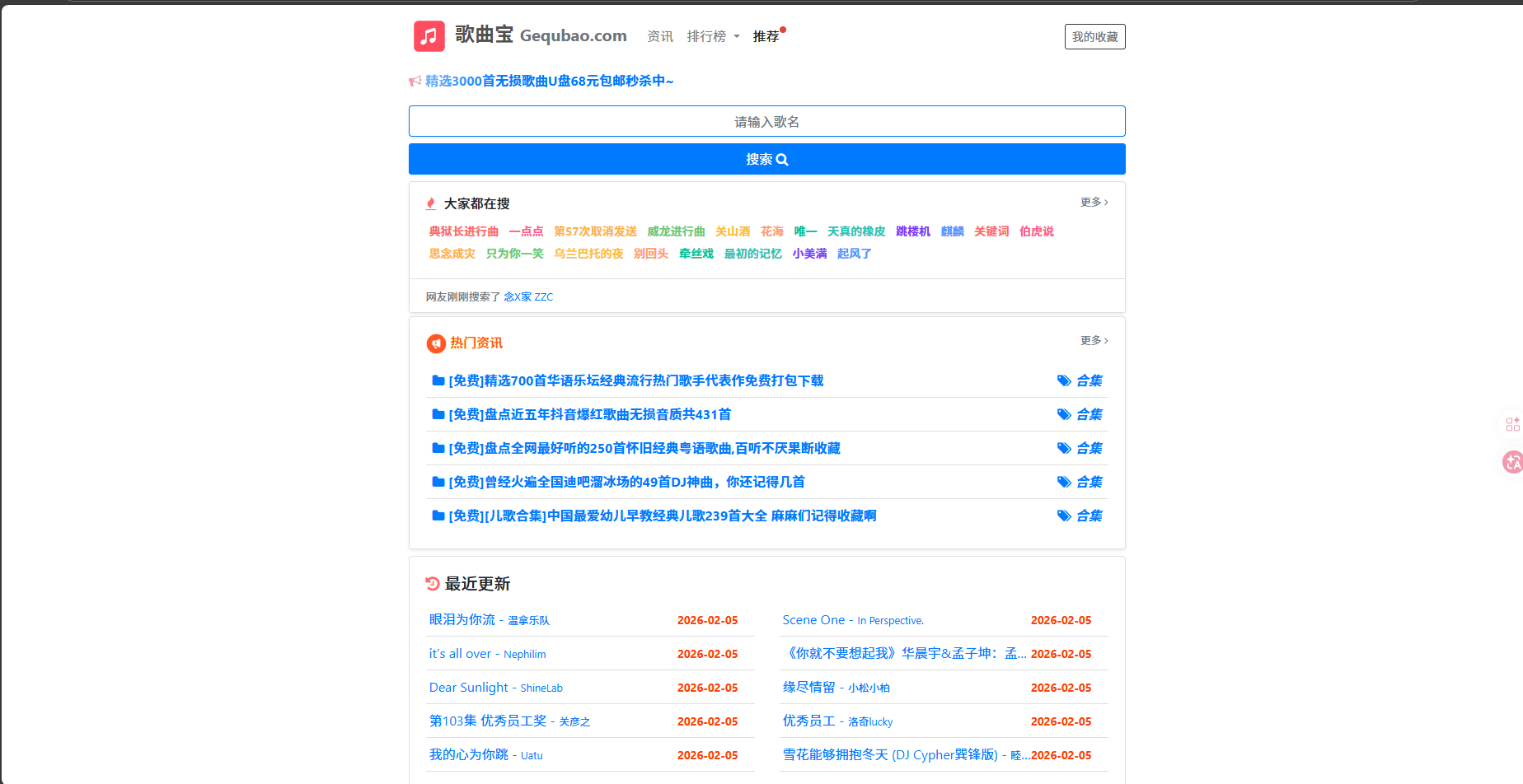 全程无弹窗广告,不用开会员、不充币,甚至**无需注册登录**,打开网页就能操作,彻底告别听歌插播广告、下载弹会员的糟心体验。【截图1:歌曲宝简洁首页,无任何广告弹窗】
